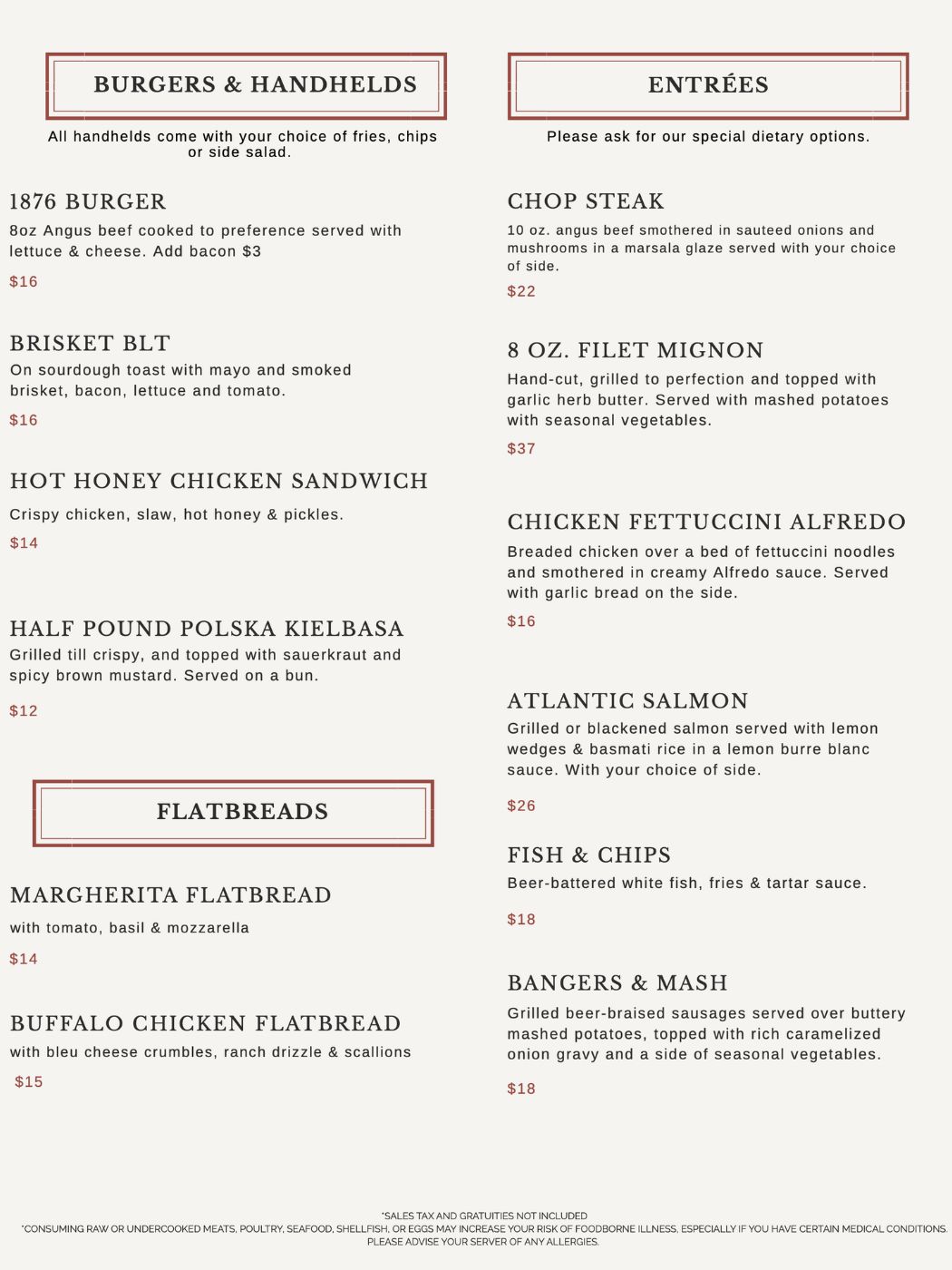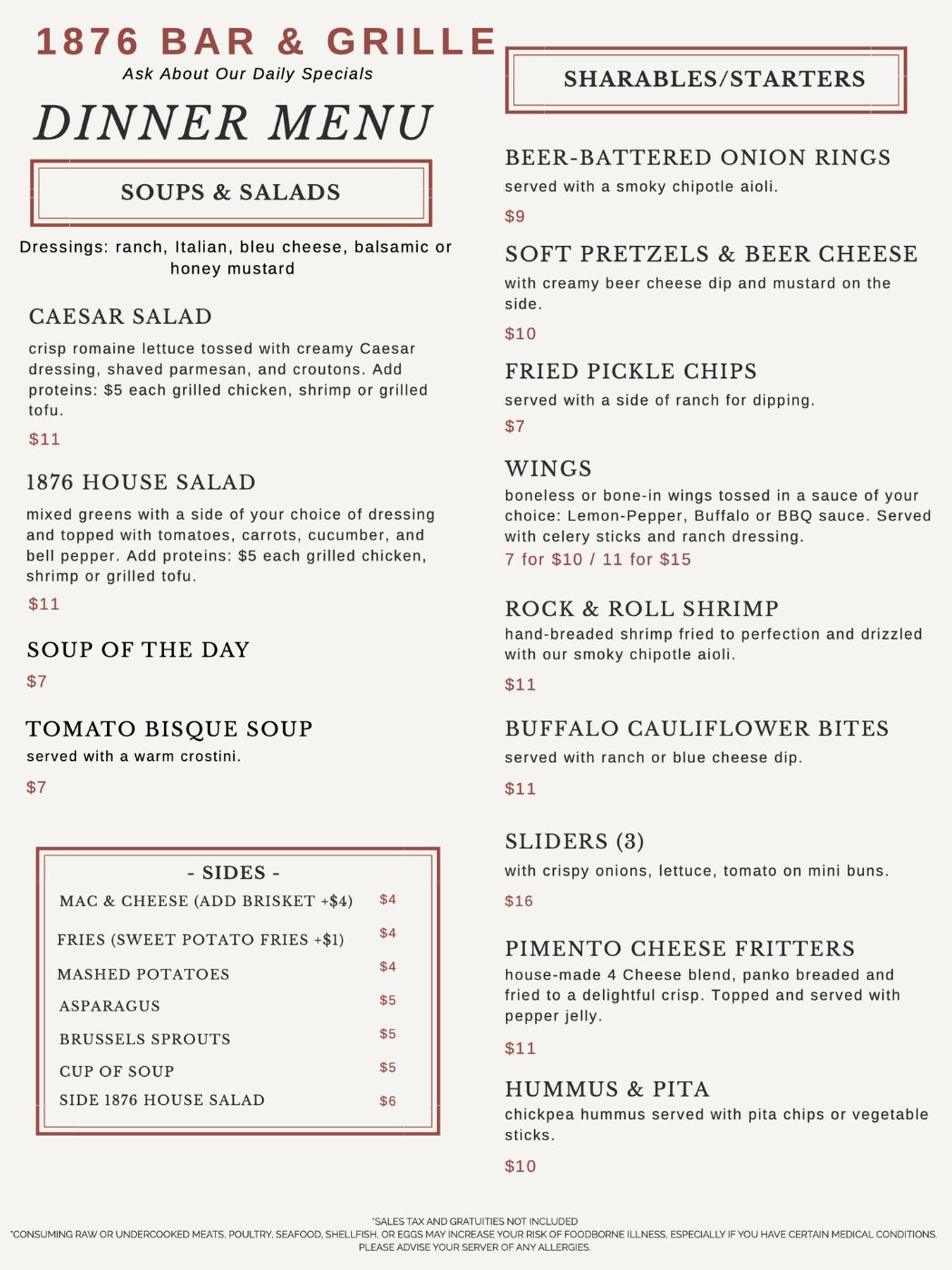 Whether you're a hotel guest, a local looking for a new favorite spot, or looking for a place to host your next private party or event, we can’t wait to welcome you to 1876 Bar & Grille—where great food and good vibes come together.